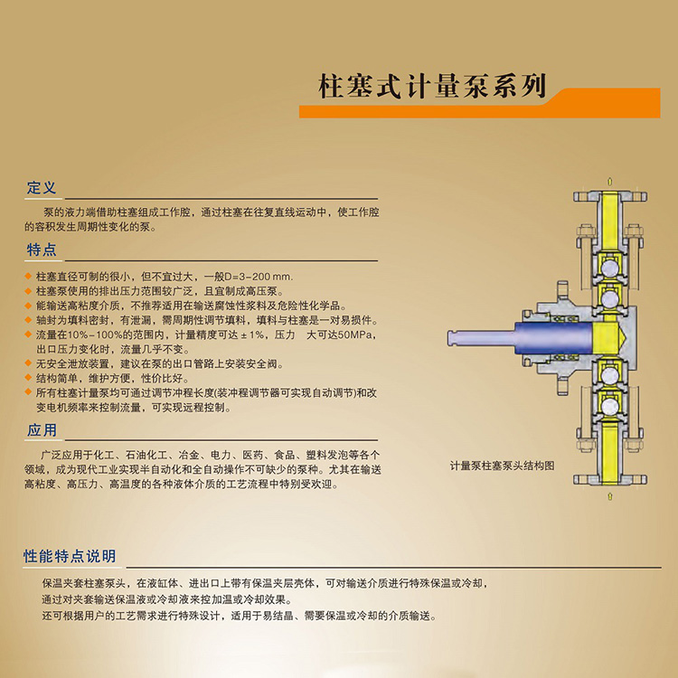 廣泛應用于化工、石油化工、冶金、電力、醫藥、食品、塑料發泡等各個領域,成為現代工業實現半自動化和全自動操作不可缺少的泵種。尤其在輸送高粘度、高壓力、高溫度的各種液體介質的工藝流程中特別受歡迎。