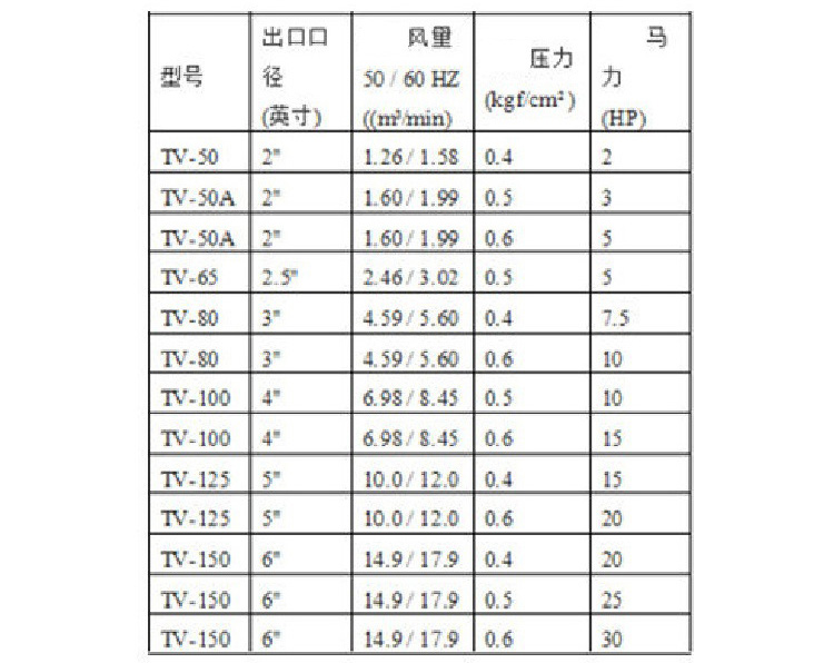 六.春鼎TV型直立式羅茨風機產品規格: 壓送用途適用壓力∶0 ~ 0.6 kgf/cm2 2 ~ 30HP另外可依特殊材質指定設計TV型直立式羅茨鼓風機產品特性較低的能源損耗∶春鼎TV型直立式羅茨鼓風機的設計能減少逆流對轉子的壓力, 相對也能減少對能源的損耗。較低的噪音∶壓力脈沖是主要的噪音源,春鼎直立式羅茨鼓風機相較于皮帶式羅茨鼓風機能有效降低噪音達五分貝。減免經常性之保養困擾∶春鼎直立式羅茨鼓風機采用直結式傳動,可減免皮帶之經常性損耗保養及機氣漏油之困擾。機器體積小,不占空間∶春鼎直立式羅茨鼓風機體積小,不占空間,而出氣口可依現場環境調整方向,安裝容易。裝置簡單∶裝置簡單、省工時、不占空間、不需隔音設備┅┅即達成低噪音之生活空間