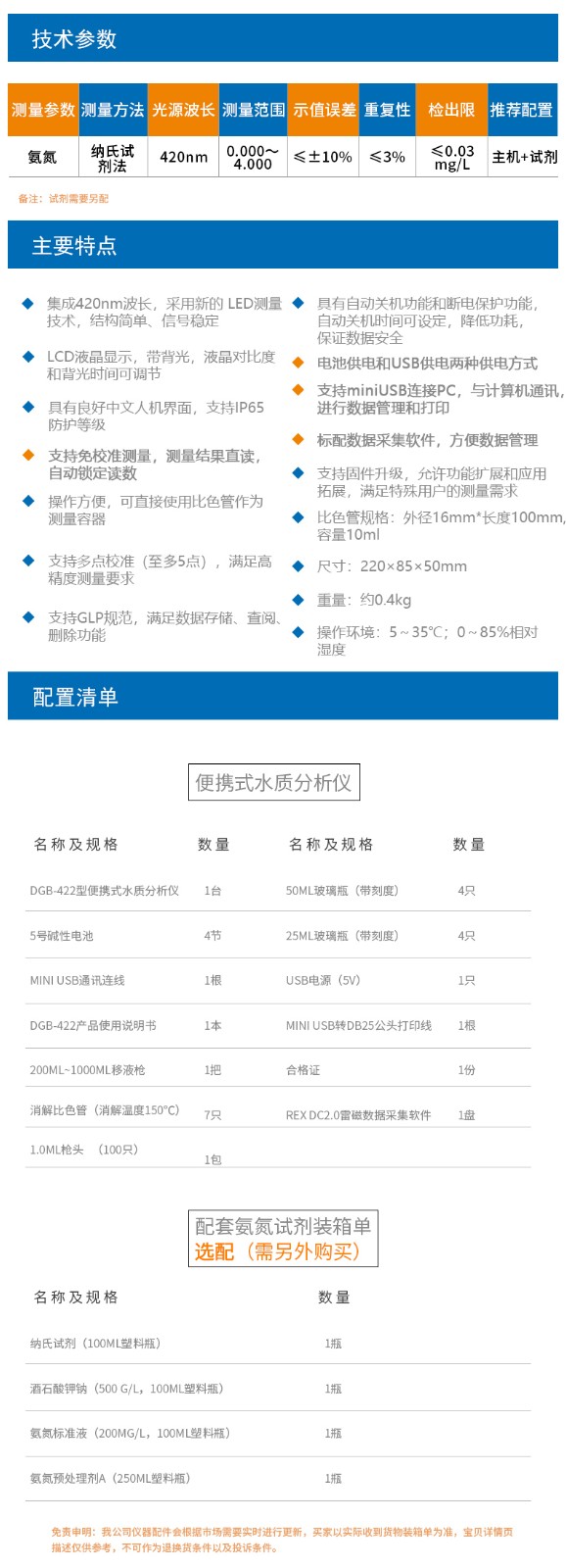 上海雷磁DGB-422便攜式水質測定儀免校準測量氨氮檢測儀測定儀