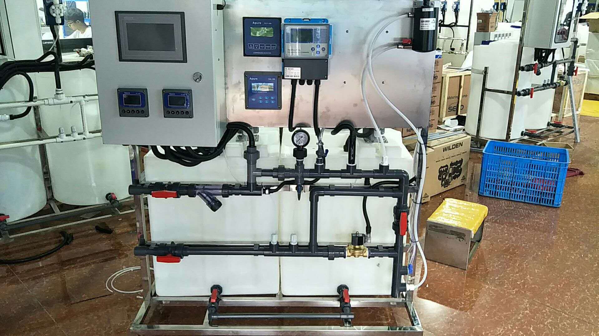 描述:該加藥裝置由主要用于造紙行業投加各種膠劑。為了保證系統24小時正常運行,該裝置使用一用一備的組合形式,為了管道使用壽命更長,所以管道均采用SS304材質及氬氟焊焊接技術。因造紙行業各階段的工藝不同,控制需要了解設備的運行狀態以及當前流量,從而更的投加藥劑。