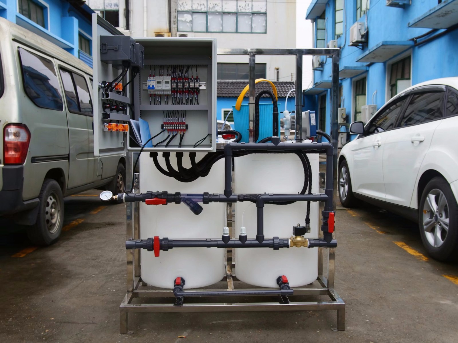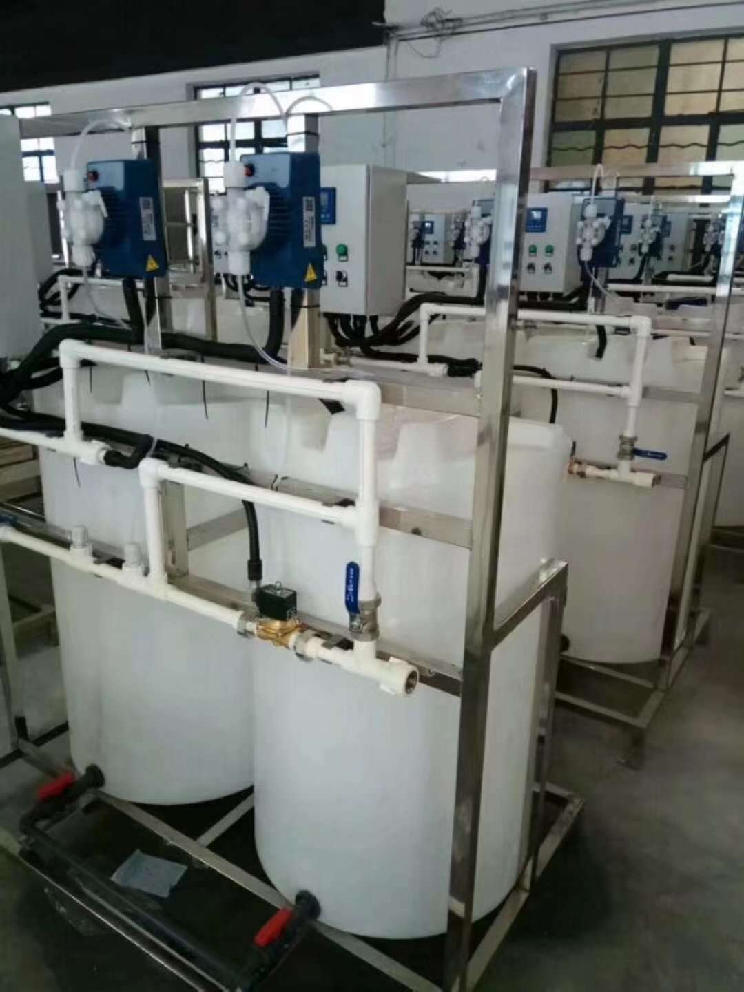 配置:該加藥裝置由計量泵、控制系統、流量計、變頻器、標定柱、背壓閥、閥和不銹鋼管道組成。