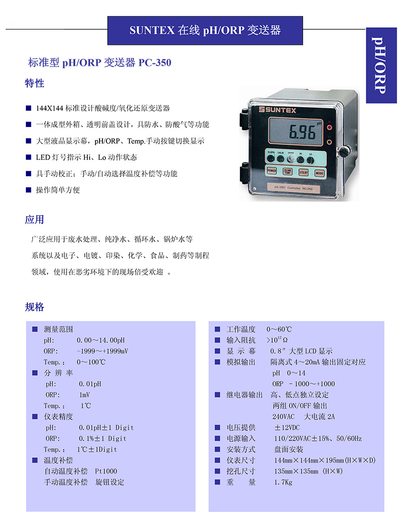 ■ 144X144 標準設計酸堿度/氧化還原變送器